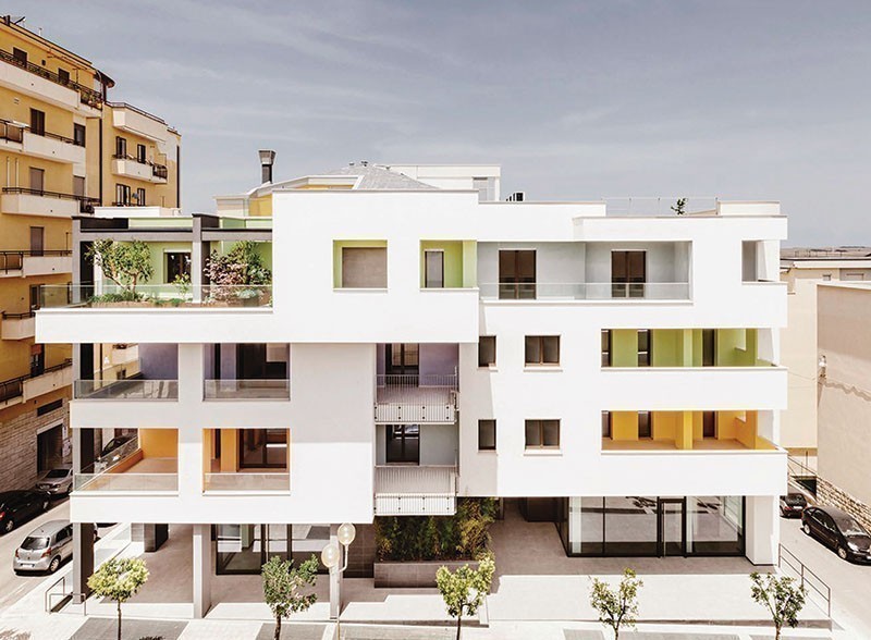 Forme, funzioni, prestazioni secondo il concetto, teorizzato da Le Corbusier nel lontano 1920 ma tutt'ora attuale, dove "La casa è una macchina per abitare": l 'involucro asseconda la forma del lotto e si integra con il contesto, denotando una flessibilità funzionale degli spazi che si traduce in un'innovativa lettura della facciata, anche grazie al trattamento di pitturazione di facciata studiato in base ad irraggiamento ed esposizione.