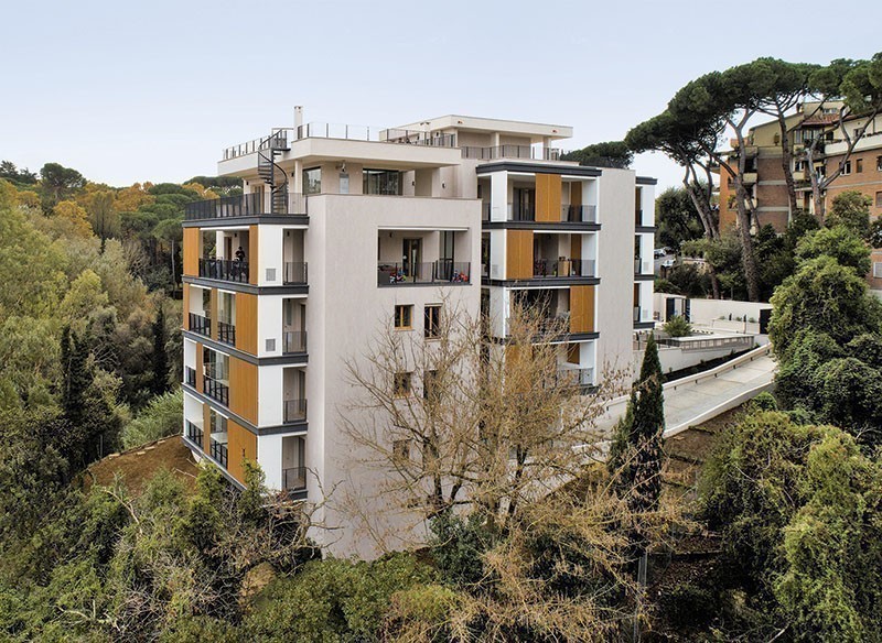 L'intervento costituisce un eccellente esempio di architettura residenziale plurifamiliare, sotto molteplici punti di vista: paesaggistico, architettonico ed ingegneristico. Sotto il profilo paesaggistico è stato particolarmente apprezzato l'inserimento dell'edificio in un contesto sensibile attraverso un volume attentamente studiato per forma, dimensione, orientamento, col fine di mitigare l'impatto sul paesaggio circostante. Di particolare interesse risulta la sagoma dell'edificio nel suo insieme che si integra molto bene con l'andamento del terreno. Sotto il profilo architettonico, ad una apparente semplicità di linguaggio e di distribuzione, si associa un'attentissima cura dei dettagli di facciata che definiscono l'involucro delle residenze, quest'ultime tutte con doppia o tripla esposizione, con ampie terrazze e viste puntualmente studiate per incorniciare il paesaggio circostante. Sotto il profilo ingegneristico il progetto risulta estremamente curato e performante, grazie anche ad un esemplare utilizzo della muratura di tamponamento in monoblocchi preassemblati con isolante accoppiato ad elevate prestazioni termiche, che garantisce eccellenti prestazioni energetiche, di isolamento acustico, di risposta del fabbricato alle azioni sismiche, nonché dei divisori interni, per l'appunto in POROTON®, dotati di elevate prestazioni acustiche a favore del comfort abitativo.