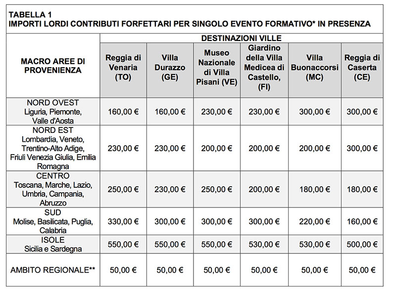 Ai partecipanti è riconosciuto un contributo a sostegno delle spese di trasferta a seconda della sede e della provenienza, come riportato in tabella