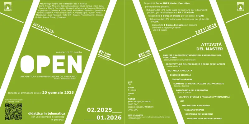 OPEN porterà gli iscritti ad acquisire competenze specialistiche di carattere interdisciplinare e multidimensionale riguardo i temi della rappresentazione e della progettazione del paesaggio, in particolare in ambiti urbani, sempre più centrali nella cultura del progetto e fondamentali per la definizione della qualità dell'habitat.
