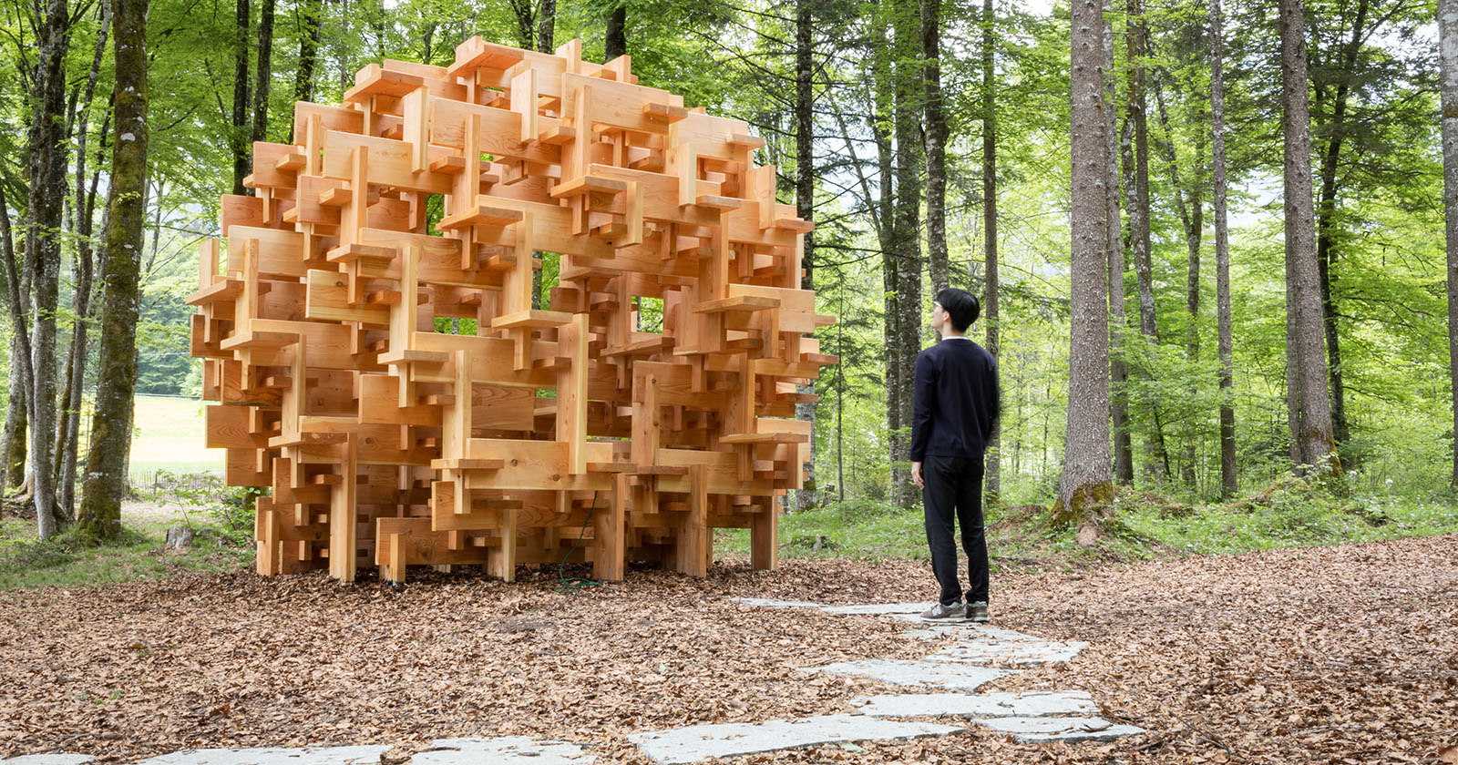 Kuma da architetto costruisce quest'archetipa entità nipponica attingendo alla materia stessa degli alberi (in questo caso in essenza di larice) per creare un'imponente struttura (6 m di diametro) di forma pressoché sferica.