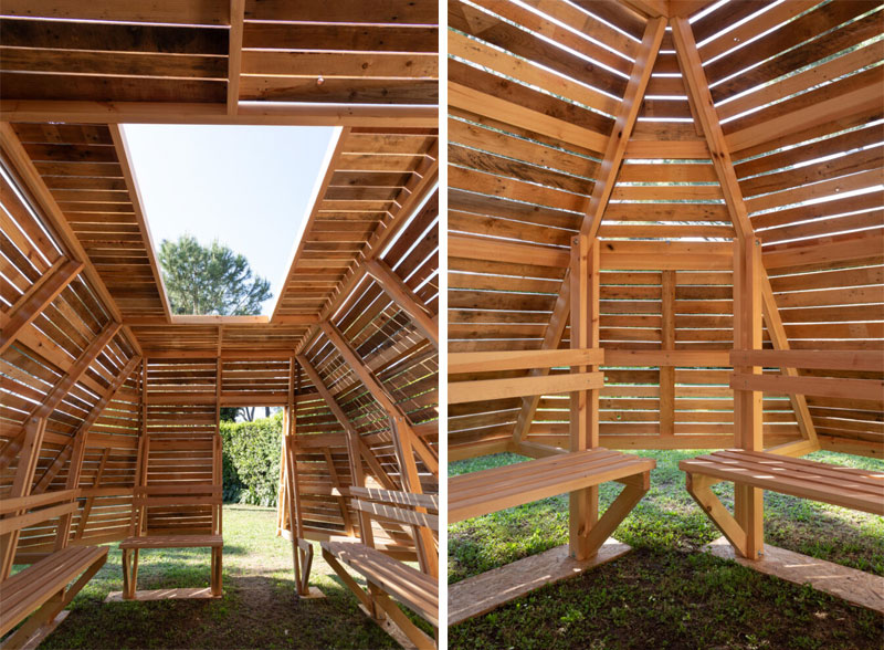 Gli elementi essenziali del padiglione - il muro e il tetto - sono fusi in un unico piano inclinato che separa, a prima vista, l'interno dall'esterno. Tuttavia, il rivestimento, realizzato in scarti di legno, rivela un rapporto molto più poroso tra l'intimità dell'interno e il mondo esterno, trasformando, al tramonto, il riparo protettore in lanterna.