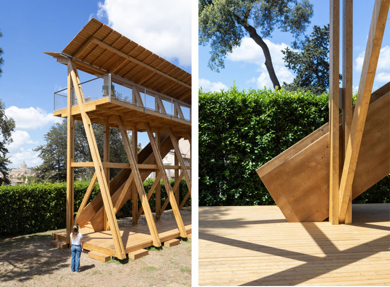 Composto da una struttura di legno che sostiene una scala lineare sospesa nell'aria, la Cabane 7L è un osservatorio che mette in relazione il giardino e l'orizzonte.