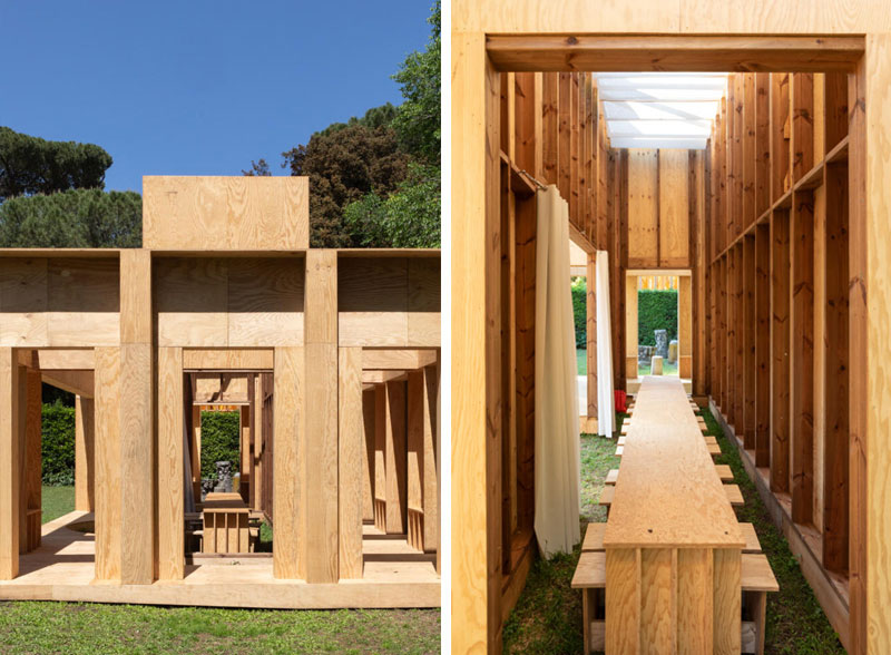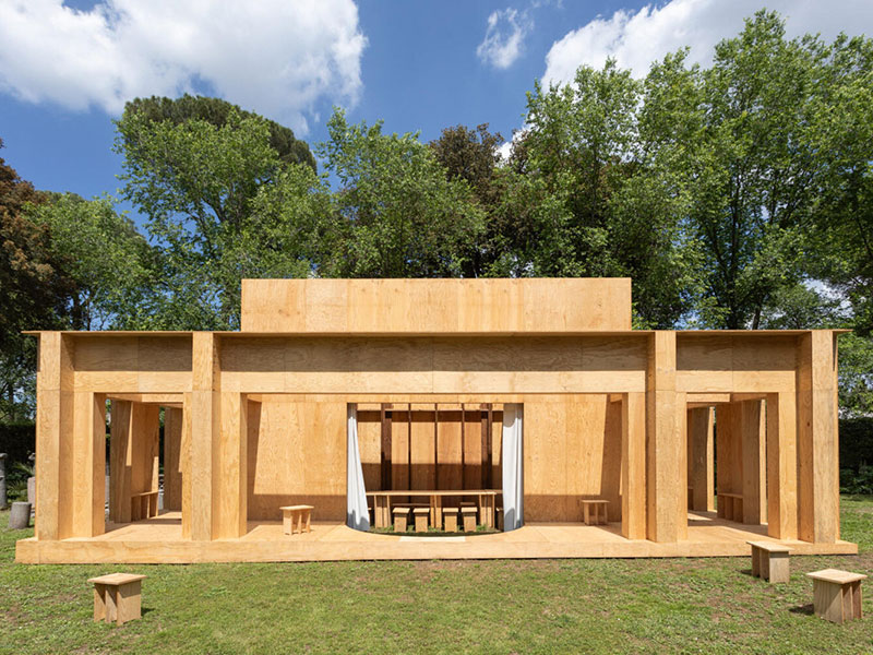 Pur essendo realizzata secondo le regole d proporzione e composizione - basamento, peristilio, corpo e cupola - qui il tempio diventa qui una capanna contemporanea, in cui fermarsi e godere dell'ombra degli alberi.