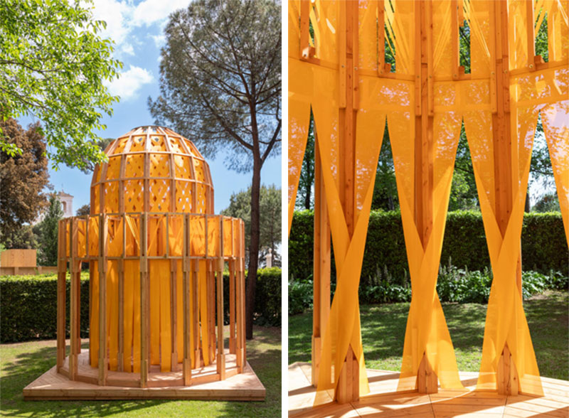 I moduli in legno e la tela tessuta attorno alla struttura accentuano la delicatezza e la leggerezza del progetto, creando un involucro permeabile al vento e all'acqua, perfetto rifugio per i visitatori grandi e piccoli.