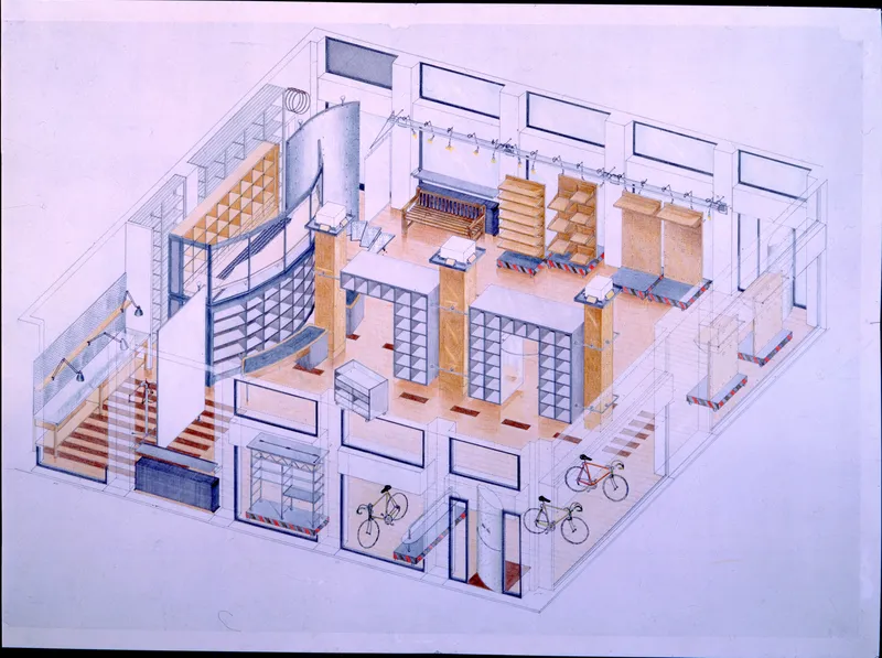Disegno assonometrico dello showroom Granciclismo (conDaniela Puppa), 1988. Courtesy Archivio Franco Raggi