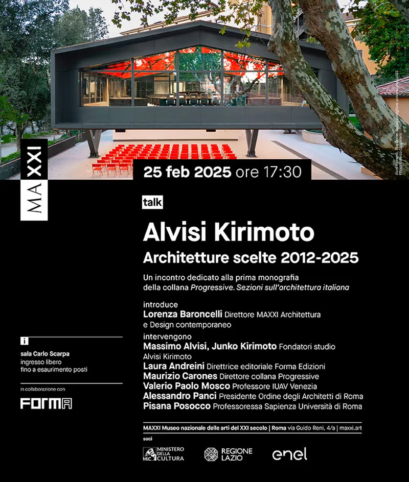Gli architetti Massimo Alvisi e Junko Kirimoto - martedì 25 febbraio - saranno ospiti del Museo nazionale delle Arti del XXI secolo di Roma, in un incontro dibattito con Laura Andreini direttrice editoriale Forma Edizioni, Maurizio Carones direttore collana Progressive, Valerio Paolo Mosco docente IUAV Venezia, Alessandro Panci presidente Ordine Architetti Roma e Pisana Posocco docente Sapienza Università di Roma.