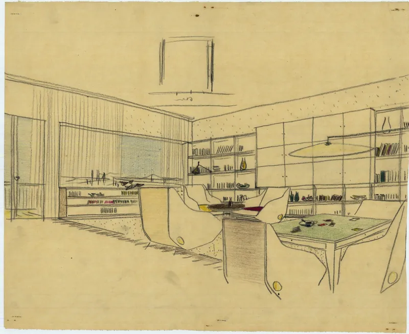 Carlo De Carli | Schizzo prospettico del soggiorno di casa Galli a Cirimido, 1948-1950