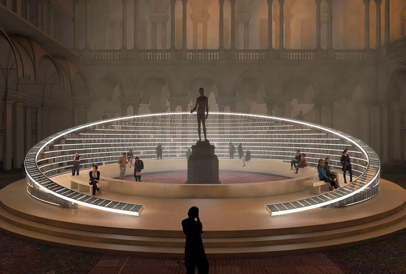 Library of Light, invece - nel Cortile d'Onore della Pinacoteca di Brera - è una potente esperienza immersiva e performativa creata dall'artista britannica Es Devlin, celebre per le sue installazioni luminose. Incontro perfetto tra design, arte e tecnologia, l'opera ridefinisce il concetto di biblioteca come luogo di sapere e connessione: la luce, metafora di conoscenza, richiama il valore custodito nei libri, creando un legame simbolico tra eredità e innovazione. L'installazione - una straordinaria scultura circolare (diametro di 18 metri), formata da scaffali luminosi contenenti oltre 2000 volumi - è il riflesso di una frase di Umberto Eco "I libri sono la bussola della mente, indicano innumerevoli mondi ancora da esplorare". Durante il giorno, mentre la struttura ruota proprio come una bussola, la luce del sole riflessa dagli specchi inclinati che chiudono la libreria, illumina le colonne, le statue del porticato e punti dell'edificio mai raggiunti prima dai raggi del sole. Di notte, la sua struttura luminosa disegna suggestivi giochi di ombre sulle pareti del cortile.