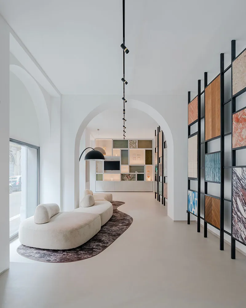 A incantare i visitatori, una scenografica galleria lunga trenta metri che custodisce 1200 campioni, classificati per materie, accanto ad una serie di stanze con allestimenti non convenzionali e spazi d'archivio che raccolgono un totale di circa 5000 pezzi, a rappresentare oltre 15000 prodotti a catalogo. Un vero e proprio tempio del progetto dove ispirazione e ricerca si fondono garantendo un'esperienza di progettazione immersiva.