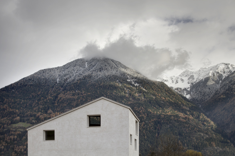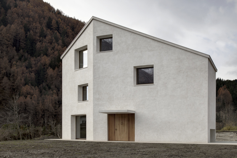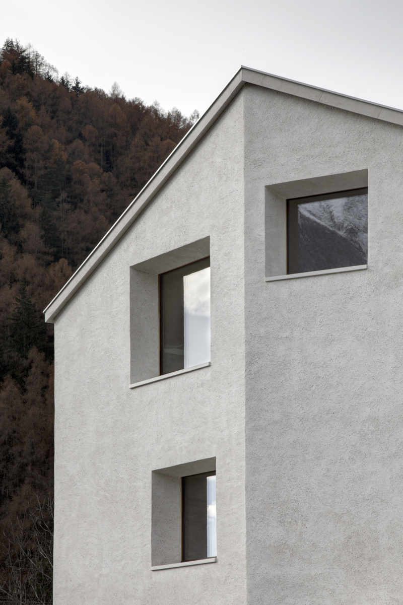 Per gli esterni, i fratelli Pedevilla, maestri nello studio della composizione di intonaci, hanno pensato ad una finitura esterna formata da sabbie locali, calce e cemento, in cui la tonalità chiara è resa dinamica da un effetto spugnato che cattura le sfumature della luce.