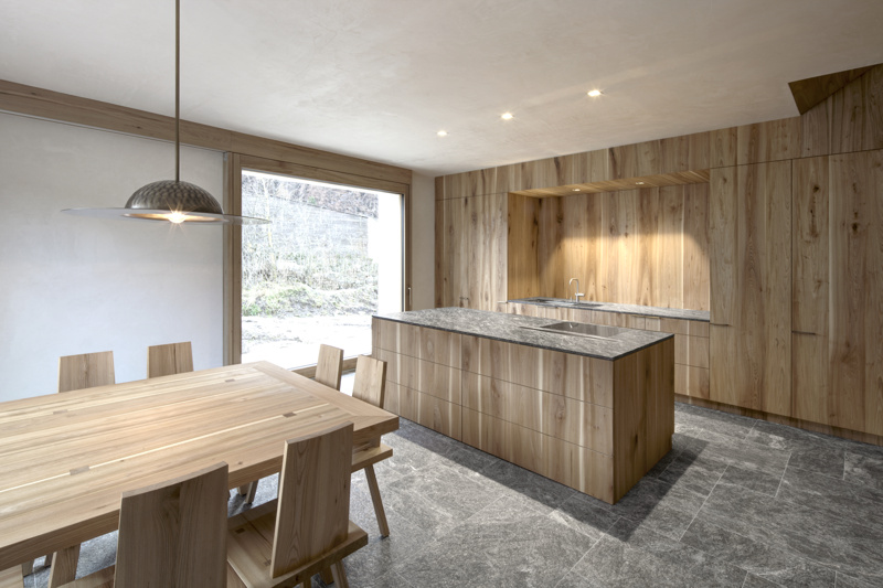 L'estremo rigore dell'esterno e la fedeltà alla naturalità dei materiali impiegati guida anche le scelte compiute per la realizzazione degli spazi interni, dove domina l'utilizzo di materie prime locali come il legno di quercia, il bronzo e le lastre di roccia Gneiss della Passiria, lavorati artigianalmente da maestranze locali per realizzare su misura arredi, infissi, porte, punti luce e pavimenti.