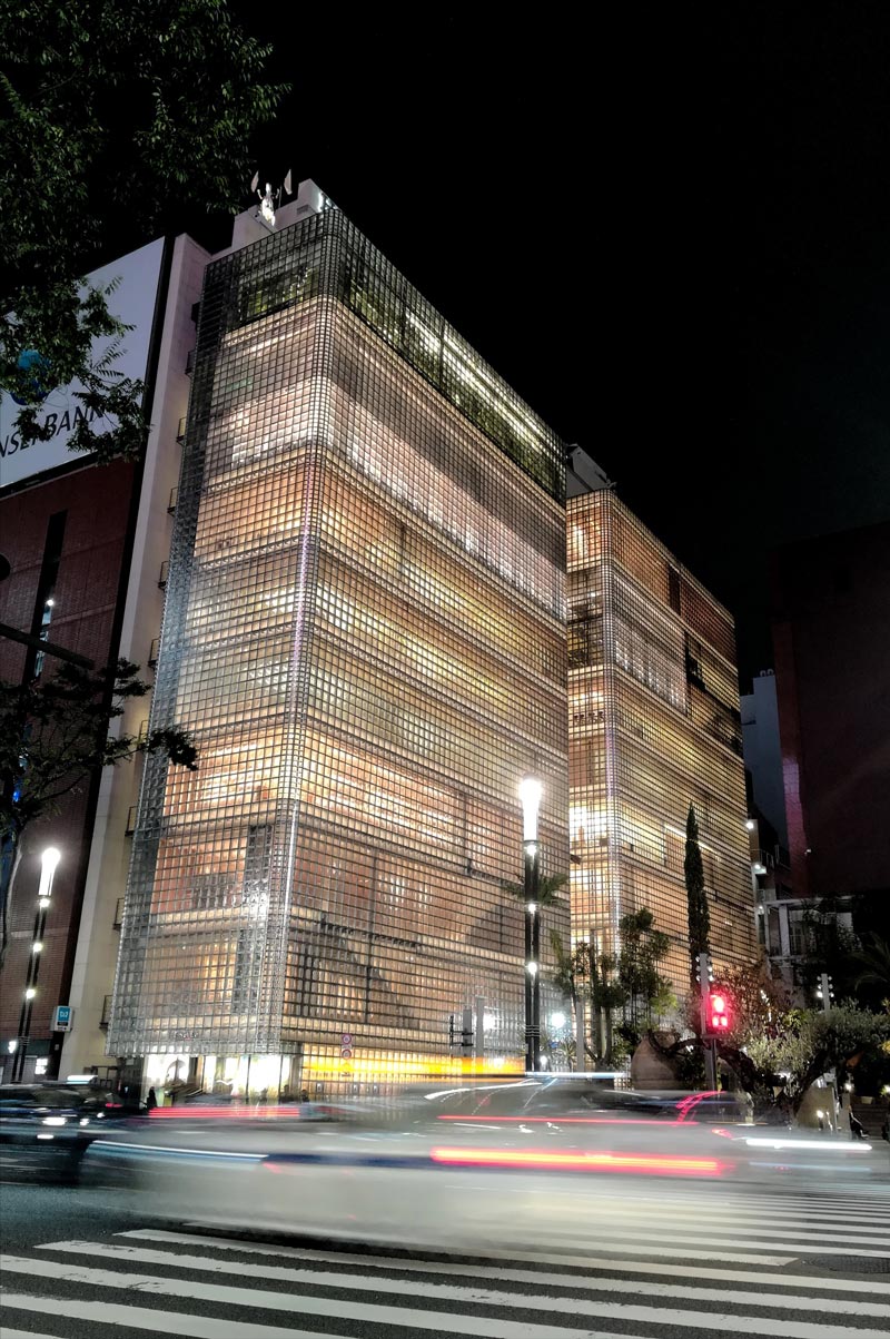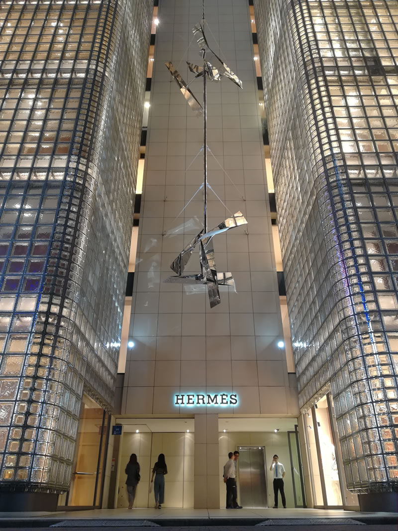 Qui gli edifici cambiano con lo scorrere delle ore e li obbligano a visitare due volte la stessa architettura, come è successo per la Maison Hermès del RPBW, "uno degli edifici più unici della zona", una "lanterna" che di notte prende vita illuminandosi e illuminando il centro di Ginza con oltre 13.000 mattoni in vetro.