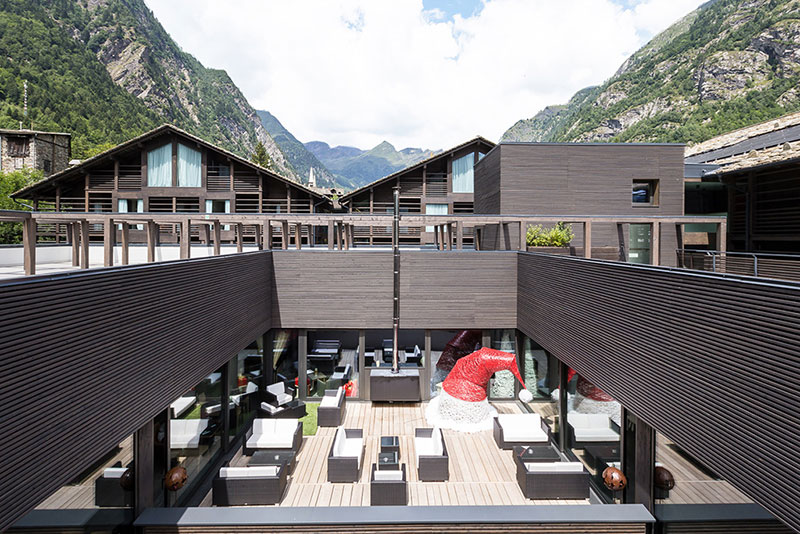 Nell'edificio a servizi, al piano terra si trovano l'accoglimento, il ristorante, il bar, il kindergarten e le cucine. Al piano interrato i depositi, il parcheggio e le spa che, con l'esasperazione della differenza di quota tra un prato e l'altro, si affacciano verso l'esterno con le piscine e il solarium. Sia il ristorante, sia le spa si affacciano all'esterno e su un patio interno disposto sui due livelli. Sopra il ristorante una grande terrazza, accessibile direttamente anche dal primo piano dagli chalet, è attrezzata con bar all'aperto con vista Monte Rosa. Gli chalet che seguono più strettamente la tipologia Walser, contengono ognuno venti camere (standard, double e suite su due livelli) e si differenziano gli uni dagli altri per la cadenza dei pieni dei bow window dai vuoti dei loggiati.