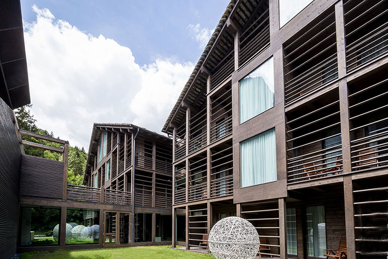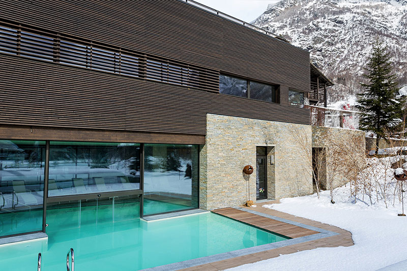 Tutti i serramenti sono realizzati in legno, con triplo vetro, per evitare dispersioni di calore. Il riscaldamento e l'acqua calda sanitaria derivano da una caldaia alimentata a pellet ad altissima efficienza. Per la realizzazione sono state selezionate eccellenze italiane, privilegiando, ove possibile, aziende locali con esperienze nell'hôtellerie.