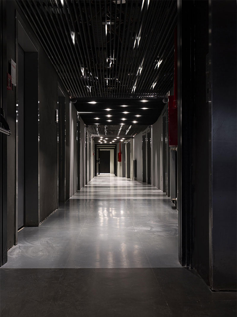 Lo studio KÄRLANDÆ ha invece affrontato il corridoio del piano, mantenendo un linguaggio allestivo più in continuità con l'esistente, attraverso un lavoro che si concentra sul colore, con la scala di grigi che aiuta a uniformare difformità e differenze. Il controsoffitto è utilizzato come un dispositivo di instabilità spaziale che grazie alle sue geometrie, permette di utilizzare la luce come un vero e proprio elemento costruttivo.