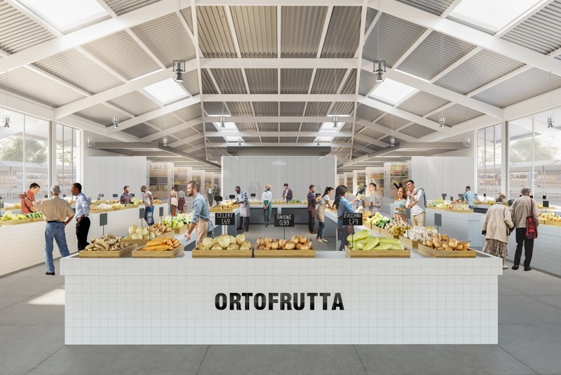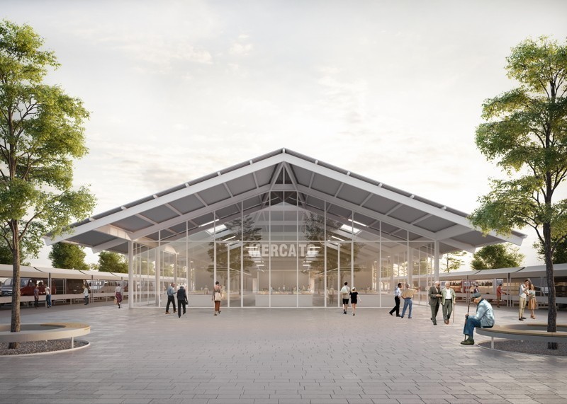 L'elemento principale che domina lo spazio è costituito dall'ampio tetto in grecata metallica che caratterizza i due corpi di fabbrica. La piazza sarà uno spazio flessibile, facilmente raggiungibile e capace di ospitare molteplici funzioni. Per l'asse centrale, in corrispondenza dei due edifici, i progettisti hanno immaginato di inserire una pavimentazione in pietra chiara, mentre per la parte che ospita i banchi del mercato hanno previsto un rivestimento in cemento lavato. L'arredo urbano è legato alle aree verdi grazie a un sistema alberature e panche circolari disposto in maniera uniforme all'interno del lotto. Un sistema di illuminazione a Led consentirà di illuminare la piazza anche durante le ore notturne, garantendo la sicurezza e l'utilizzo in qualsiasi momento.
