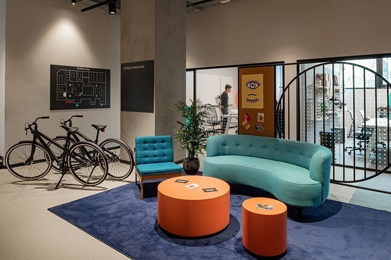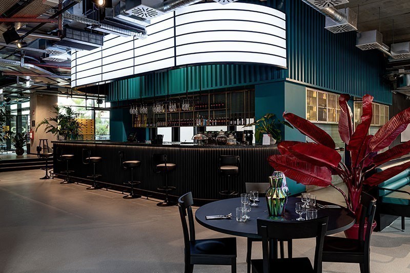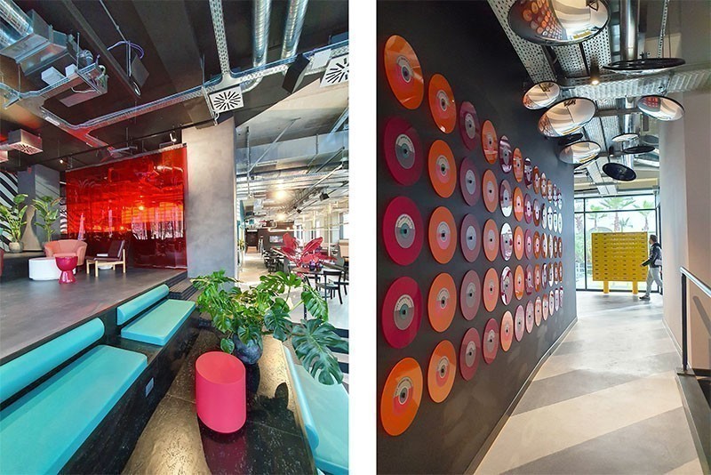 Colore, pattern, spazi fluidi, tinte sature e materiali sostenibili, come il feltro di PET riciclato e il legno OSB o il CELENIT, mix formato da materiali come il legno, il cemento Portland, la polvere di marmo e l'acqua - isolante acustico naturale e sostenibile. Ma anche grafica e arredi dal sapore vintage scelti non solo per la loro estetica morbida e accattivante ma anche per rispettare quella logica del riutilizzo che prevede di recuperare il più possibile e dargli nuova vita.