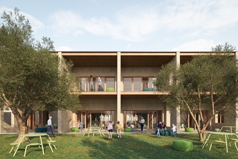 «La successione logica delle funzioni, divise in spazi comuni affacciati sui perimetri esterni e area scolastica posizionata al centro del lotto, delinea la volontà di realizzare una scuola aperta alla cittadinanza. Le grandi vetrate degli spazi comuni si fanno carico di mostrare all'esterno le funzioni contenute nei fabbricati, dichiarandosi fin da subito alla collettività, mentre quelle delle aule hanno l'obiettivo di dotare lo studente di un nuovo importante elemento: la natura. Le aule, infatti, si aprono direttamente sull'uliveto storico che diventa strumento didattico, dove imparare, giocare, riposare e socializzare», affermano i progettisti di Cinque A.
