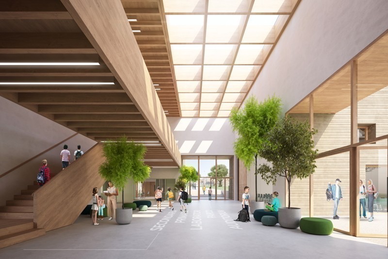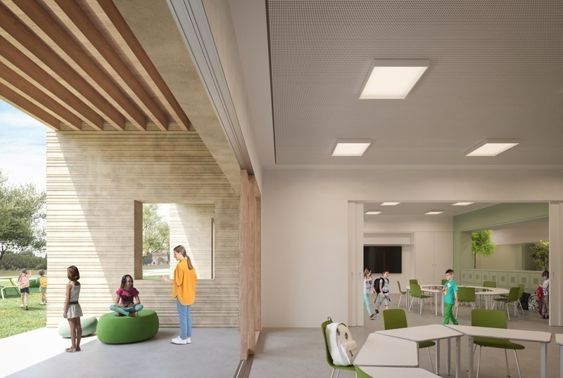 «Così come l'esterno - continuano gli architetti - anche gli ambienti interni si dilatano in spazi flessibili e concatenati, fisicamente e visivamente, tra loro. La volontà di lasciare completa libertà agli utenti, e soprattutto agli studenti, di utilizzare lo spazio secondo le proprie esigenze, ha portato alla progettazione di grandi spazi condivisi, ricchi di luce e di elementi naturali».