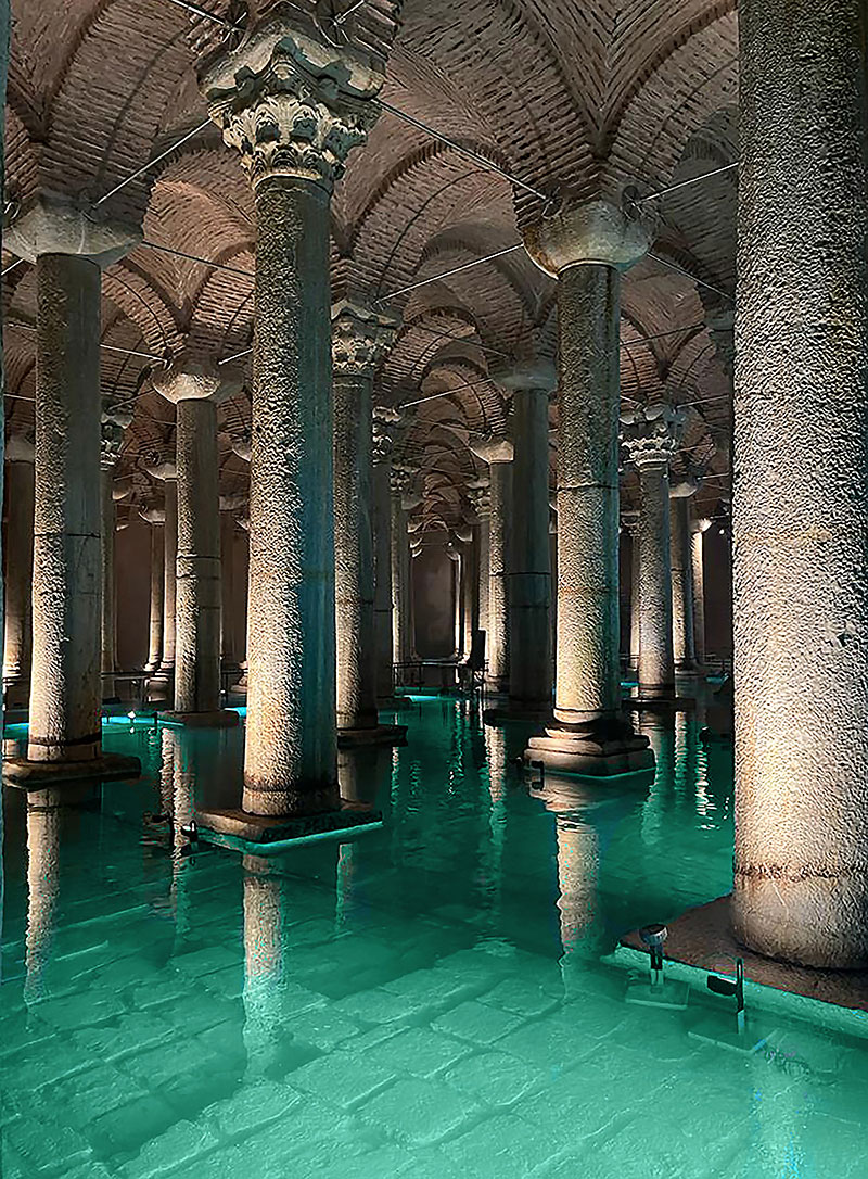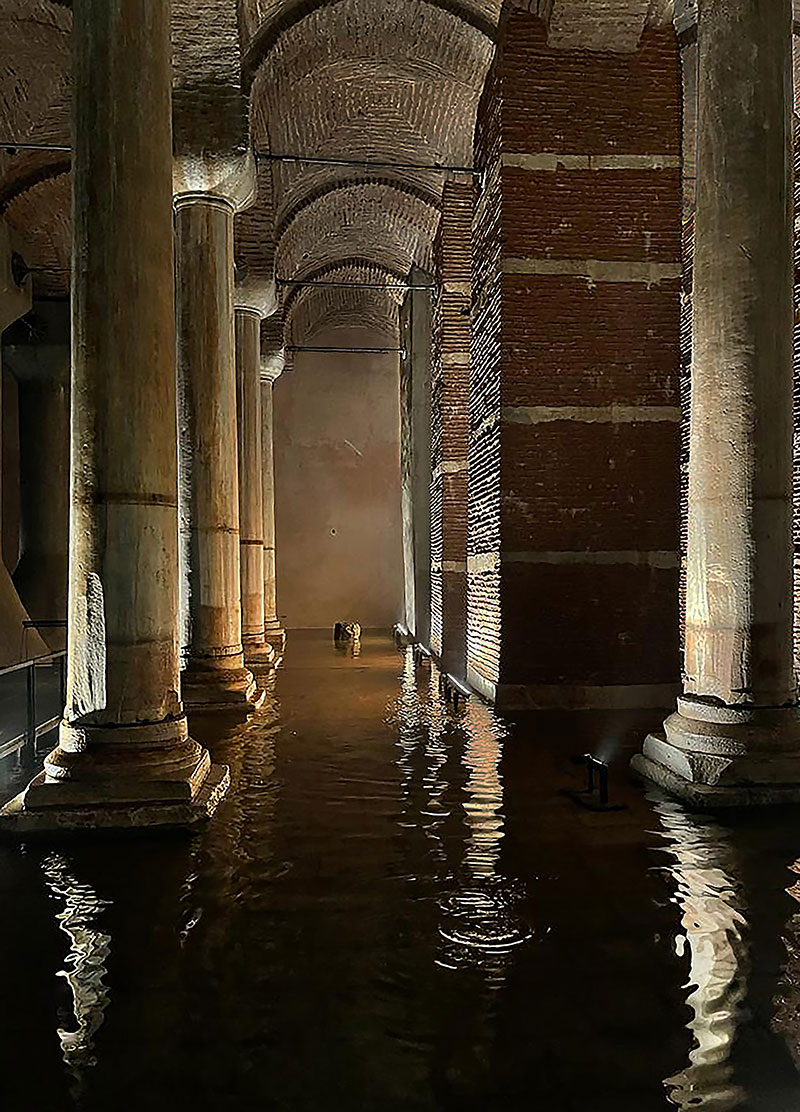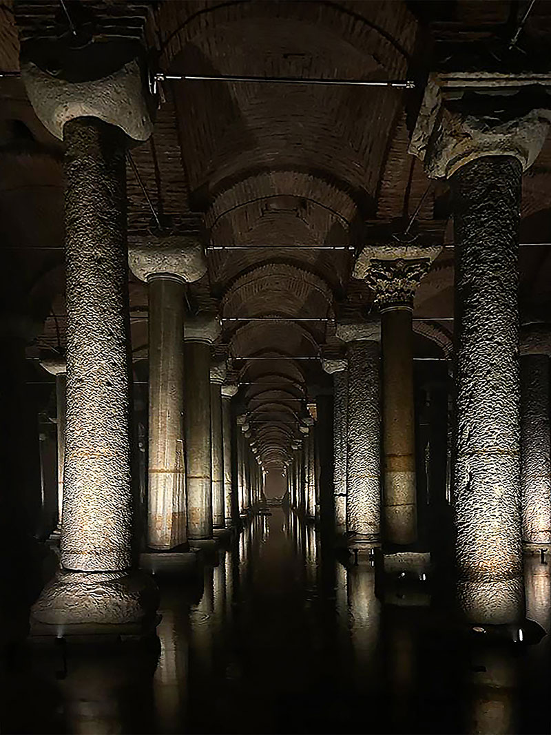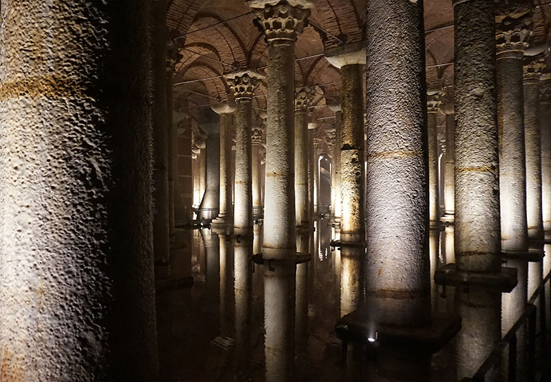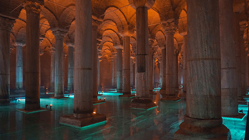 Nata come opera idraulica per fornire l'acqua al palazzo imperiale e ai luoghi limitrofi, la Cisterna Basilica di Istanbul - Yerebatan Sarayi (questo il nome turco che significa "Palazzo Sommerso") - risale all'epoca dell'imperatore Costantino, poi ampliata nel 532 dall'imperatore Giustiniano durante il periodo d'oro dell'Impero Romano d'Oriente. Per tutto il Medioevo venne dimenticata, riscoperta nel XVI secolo per essere riaperta al pubblico solamente nel 1987, con un'affluenza di pubblico pari a quella del Louvre e del Colosseo.