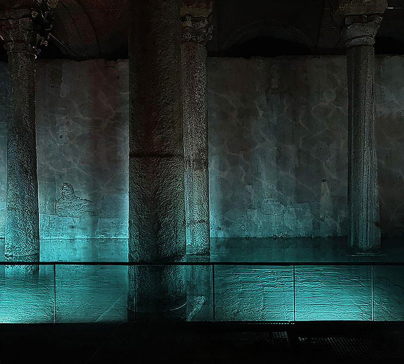 È una foresta di colonne che sembra galleggiare sull'acqua quella che, varcata la soglia d'ingresso, proprio nella piazza di Santa Sofia e, scesi nel sottosuolo, si materializza davanti agli occhi dei visitatori.
