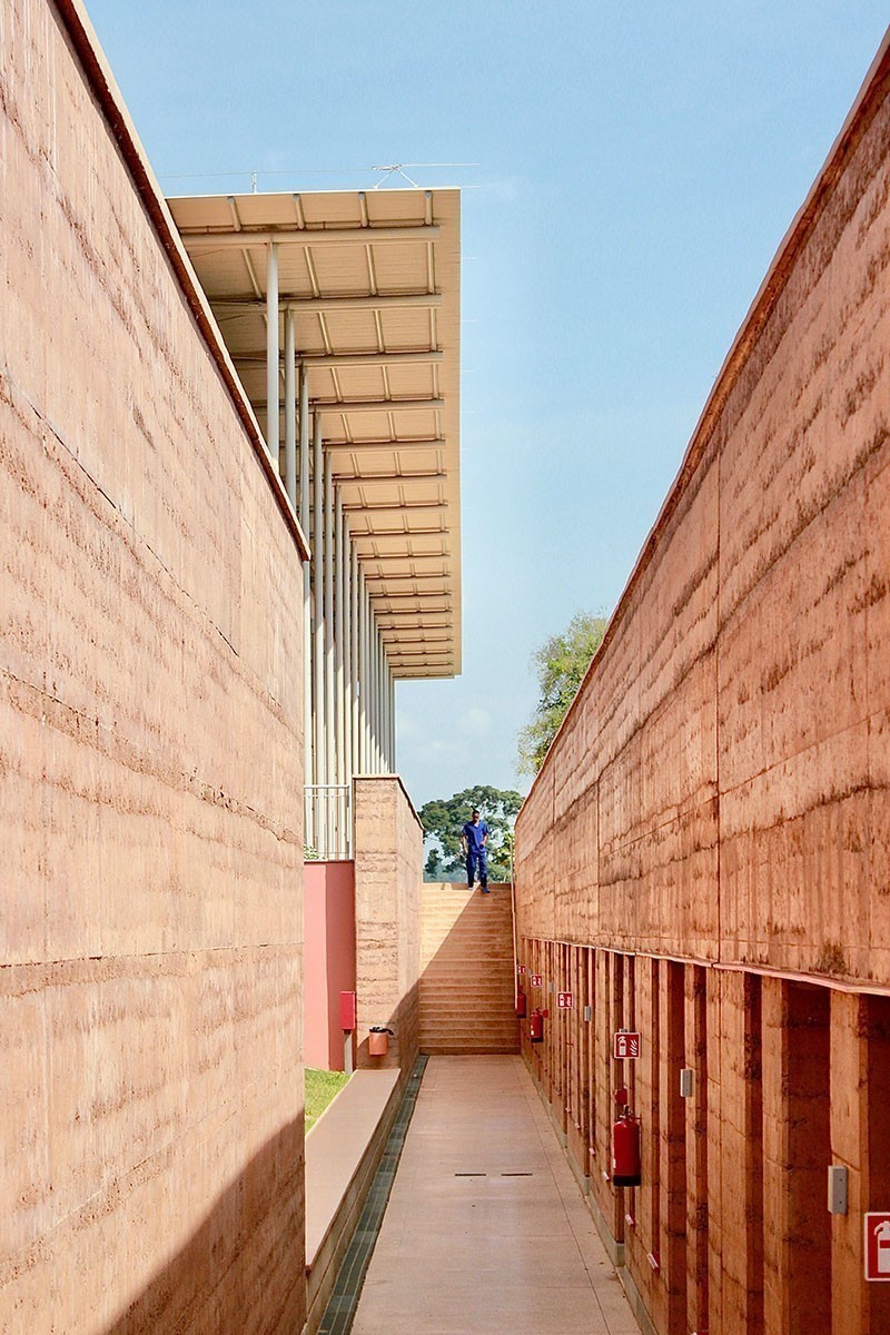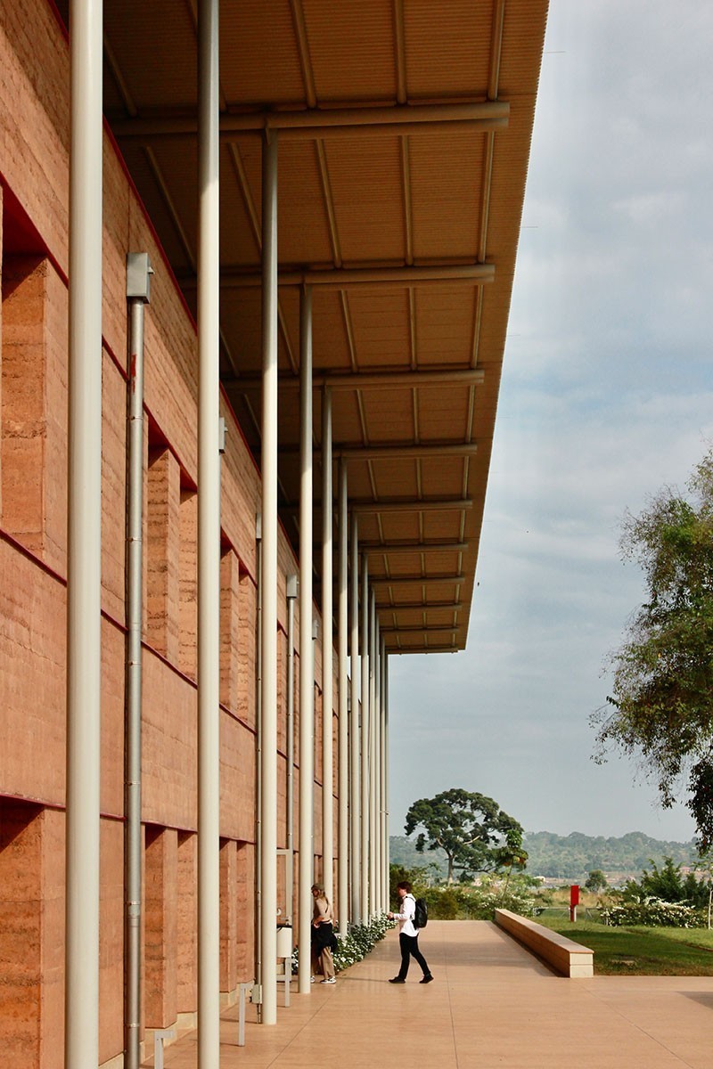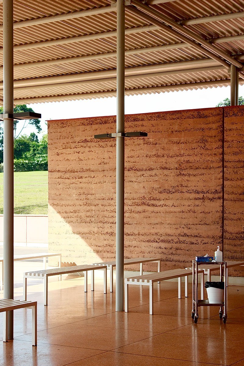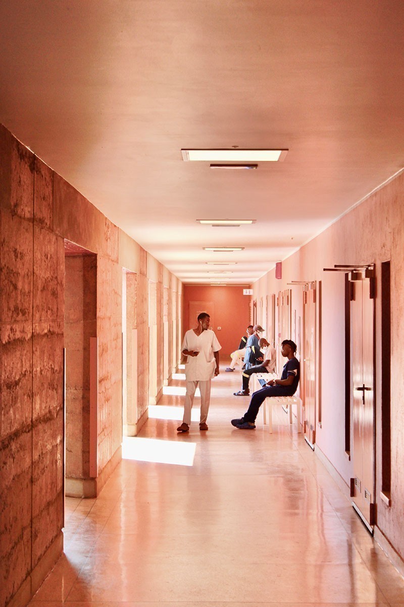 L'ospedale è costruito in terra pisé, una tecnica tradizionale che utilizza la terra cruda e aiuta a garantire un'inerzia termica in grado di mantenere costanti temperatura e umidità. "Una delle parti più speciali del progetto" - ha commentato Nick sui social - "e la parte che ha continuato ad affascinarmi durante l'intera visita, è stata la materialità. Utilizzando il terreno degli scavi di fondazione, i muri di terra battuta si ancorano sia al sito, sia alla storia dell'edilizia in questa regione. Le pareti pesanti sono in contrasto con il tetto in acciaio leggero, per peso, matericità e consistenza."