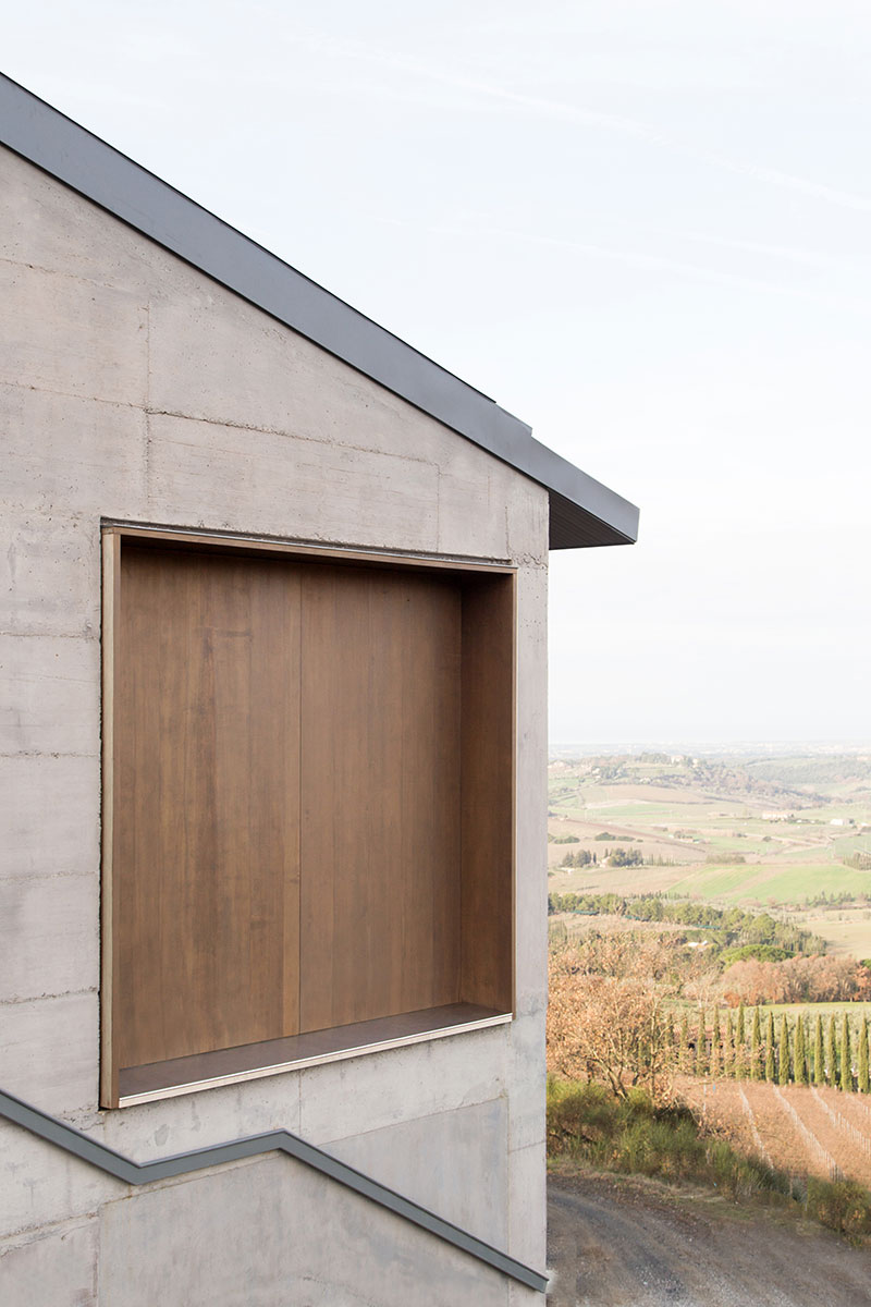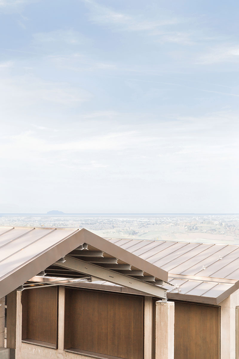 La copertura, realizzata in lastre di zinco titanio dello stesso colore delle strutture in acciaio e dei pavimenti interni ed esterni, mostra una tonalità di grigio in armonia con l'intero complesso edilizio e con il paesaggio dei vigneti circostanti.
