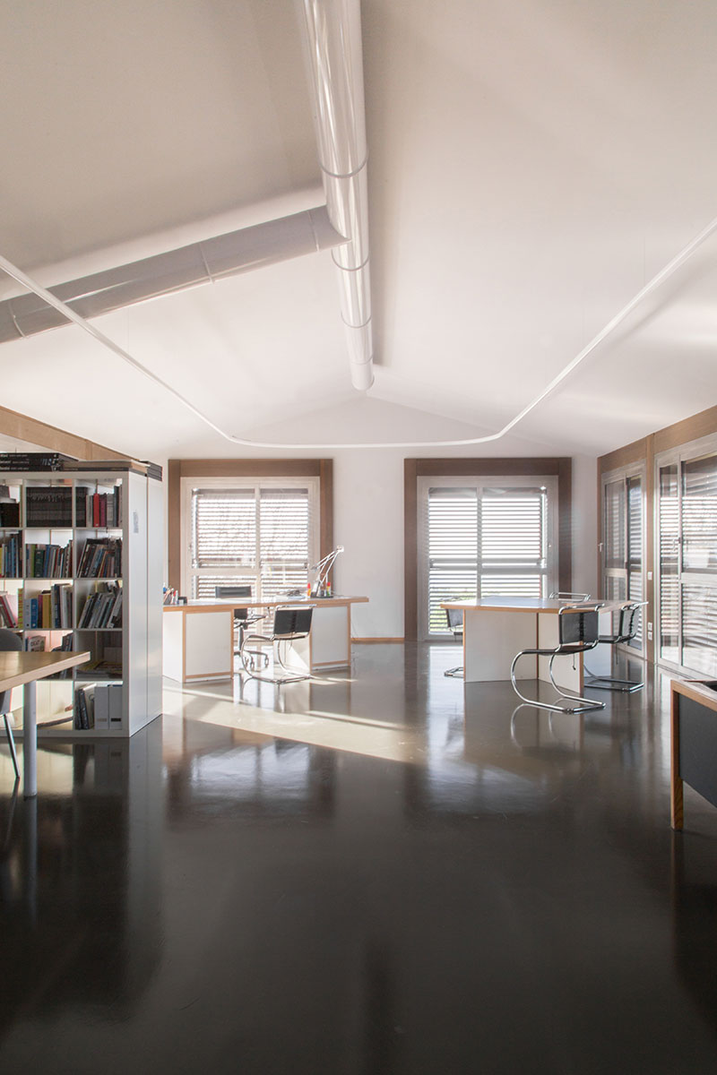 Gli interni - semplici ed essenziali - si caratterizzano per la pavimentazione monocromatica in tinta con la superficie esterna in Pietra di Matraia, proveniente da una cava vicino a Lucca.
