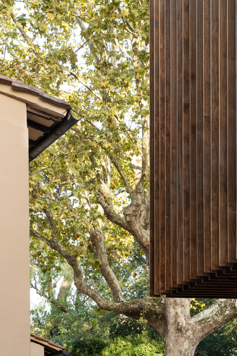 Colori, texture e materiali di progetto si mixano armonicamente, come le tonalità del rivestimento metallico e dell'intonaco graffiato che crea un tutt'uno con la nuance calda del legno, in un gioco equilibrato di richiami e di contrasti.