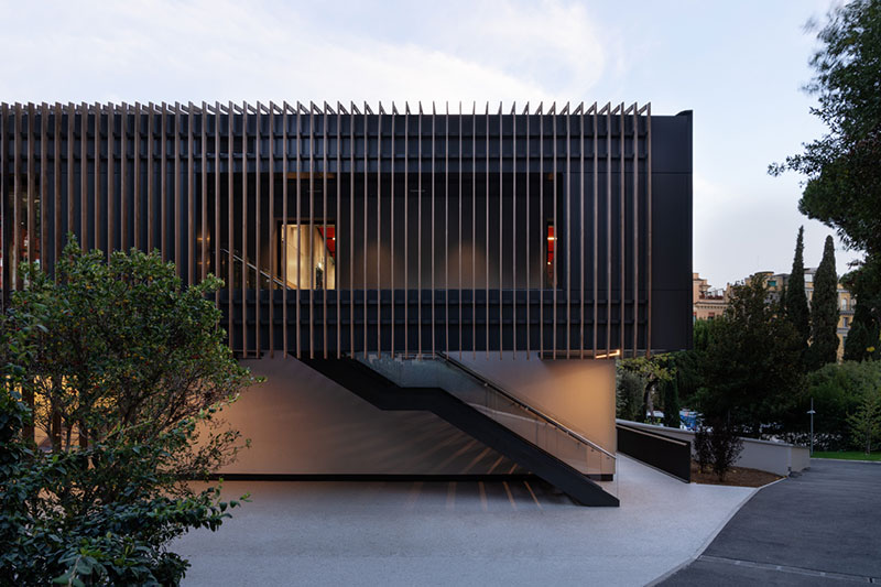 Situato a pochi passi dal polmone verde di Villa Ada, nel cuore del quartiere romano dei Parioli, l'edificio - sviluppato su due livelli per un totale di 1.500 mq - sembra voler entrare in simbiosi con il paesaggio come fosse una casa sull'albero, riprendendone la forma oltre che la dimensione domestica degli spazi interni.