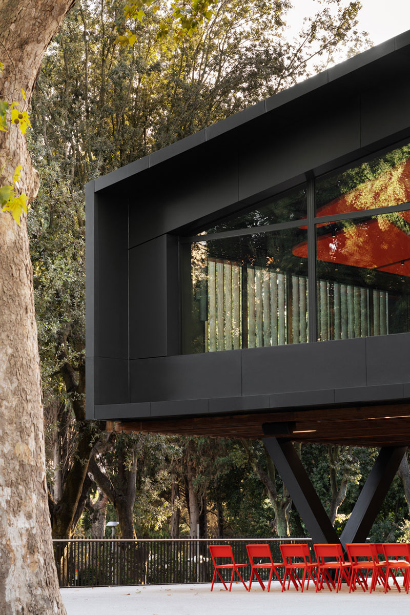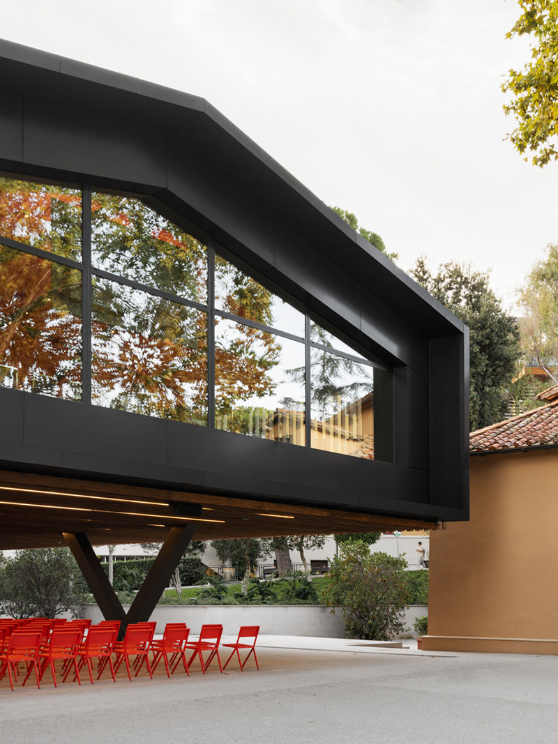 Il piano terra, invece, visibilmente arretrato, sottolinea la leggerezza del volume superiore e crea uno spazio aperto e coperto attrezzato per corsi e attività all'aperto.