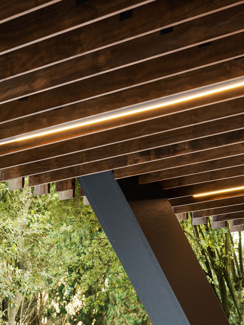 La pelle permeabile e trasparente - in listelli di legno naturale e vetro - fa sì che la struttura si dissolva nel paesaggio, creando un dialogo privilegiato tra architettura e contesto e offrendo, al tempo stesso, uno spaccato dinamico delle attività che si svolgono al suo interno.