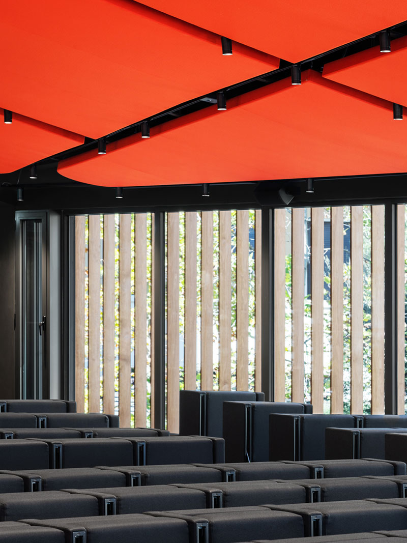 I pannelli acustici sospesi che definiscono il controsoffitto dell'anfiteatro, di colore rosso corallo, catturano, invece, l'attenzione fin dall'esterno, mentre la loro silhouette organica rafforza il dialogo con il boschetto adiacente. Questa tonalità è ripresa anche negli arredi e in alcuni elementi delle aule, garantendo coerenza visiva all'intero complesso, specie nelle prime ore serali, quando il volume si accende come una lanterna nel bosco.