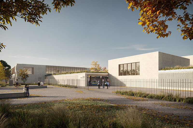 Attraverso la demolizione graduale dei vecchi edifici, per consentire lo svolgimento delle attività rendendo meno fastidioso il necessario trasferimento degli alunni in sedi temporanee, il progetto si confronta con il contesto attraverso geometrie semplici e un attento uso dei materiali.
