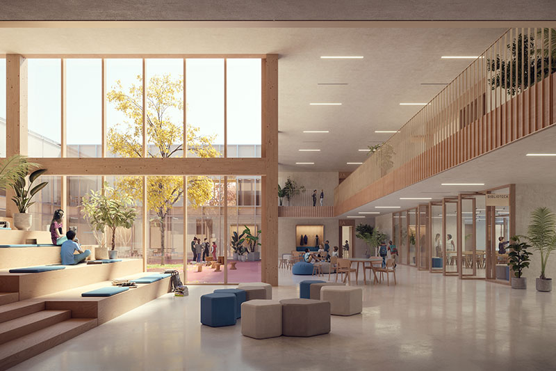 La struttura si articola in tre volumi distinti che circondano un ampio cortile centrale, vero cuore del complesso, delineando uno spazio protetto e calibrato per gli studenti, ma anche idoneo ad accogliere la cittadinanza in varie fasce orarie della giornata. Proprio come un moderno Centro Civico, il polo scolastico integra servizi aperti alla comunità del quartiere, con accessi alle palestre, alla mensa, all'auditorium e alla biblioteca.