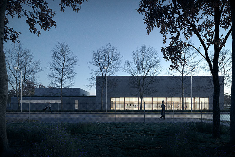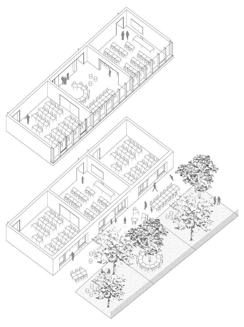 Basato sui principi di flessibilità e adattabilità degli spazi in ottica futura, il progetto introduce possibilità di modificazione dimensionale degli spazi e di molteplice configurazione dei setting didattici interni alle aule. Allo stesso modo, gli spazi esterni - pensati come naturale estensione dello spazio interno - ne riflettono le funzioni: così la corte centrale, circondata da funzioni più pubbliche, assume di conseguenza un aspetto più civico, mentre lo spazio davanti alla palestra, unitamente allo spazio a est vicino ai campi da calcio, assume un carattere più sportivo. Lo spazio esterno antistante le aule potrà, invece, essere utilizzato come luogo per apprendimento all'esterno e per gli orti didattici.