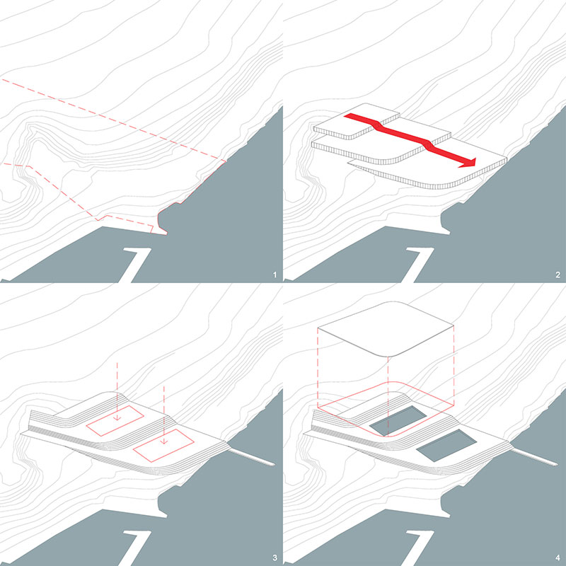 Assecondando la morfologia del terreno, il progetto si articola su tre livelli e garantisce, così, il rapporto visivo tra le due piscine, il mare e l'andamento della costa, mimetizzato e al tempo stesso riconoscibile per la grande copertura della piscina che appare come una sorta di "vela" sostenuta dall'azione del vento.