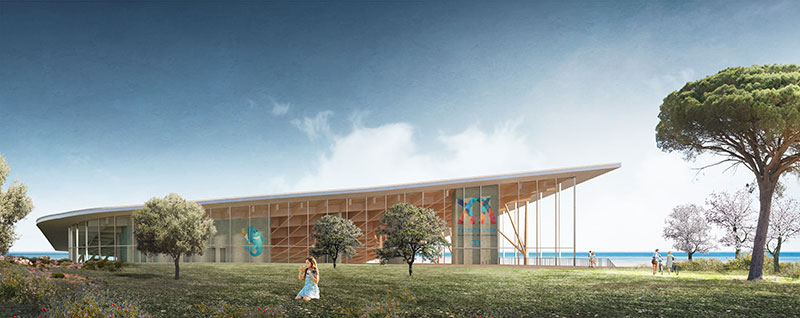 Un edificio ponte tra terra e mare insomma, che con estrema linearità e semplicità riesce a diventare icona e ad integrarsi nel contesto, grazie alla copertura leggera ispirata, nei colori, alle tonalità del mare, che ne fa quasi dissolvere la consistenza.