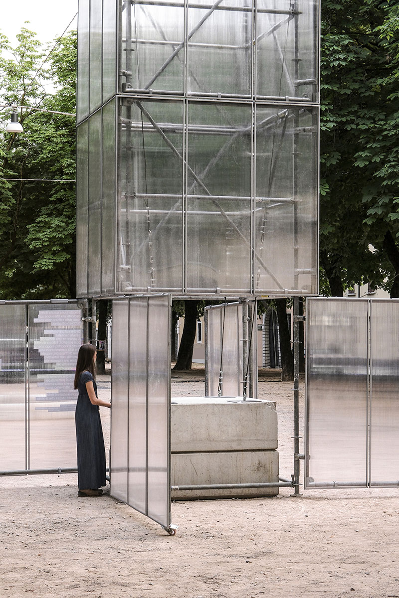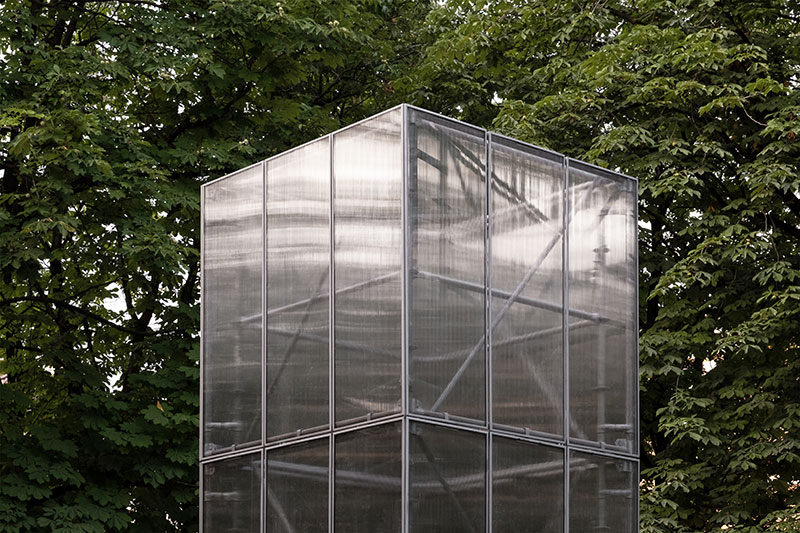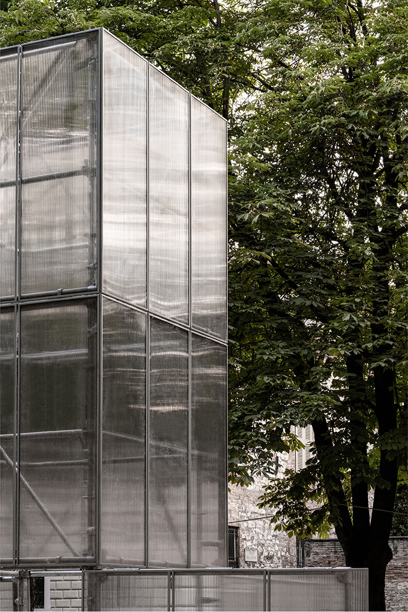 Realizzata in tubi innocenti, ferro zincato e policarbonato - per essere montata e smontata facilmente in più luoghi della città - quando è chiusa si configura come un landmark all'interno di piazza Tebaldo Brusato, mentre quando è aperta, annuncia l'accadere di qualcosa o di un'attività.