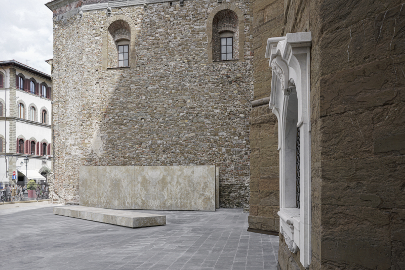 Qui sono visibili solo due elementi: il blocco parallelepipedo che perimetra e protegge la scala e la seduta posta al centro della piazza. Un'urna a dimensione urbana, così viene definita dai progettisti la configurazione urbana del progetto, che allude alla memoria, sempre viva, che San Lorenzo custodisce e trasmette attraverso la chiesa, la Biblioteca laurenziana e le tombe. Due le opere d'arte prese come riferimento: il Giudizio universale di Beato Angelico e la Resurrezione di Piero della Francesca. Entrambe «vincolano la morte alla vita, al suo continuo riformarsi e riprodursi. Tale è il senso più profondo del museo», spiegavano i progettisti nella relazione di progetto.
