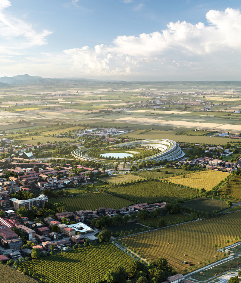 L'area di progetto, a cavallo tra l'espansione urbana e il Parco del Po e del Morbasco, diventa nuova porta d'accesso per il sistema naturale. Il nuovo ospedale si sviluppa in continuità con il paesaggio del parco della Salute, segue un andamento semicircolare e garantisce la permeabilità sia fisica sia visuale con l'ambiente naturale.