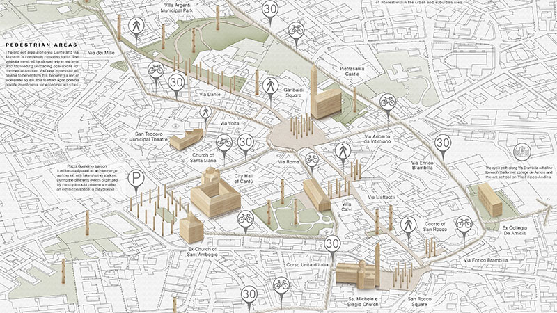Ricco di stimoli strategici, il progetto delle due giovani progettiste lombarde propone soluzioni che abbracciano sia la larga scala che quella locale. Il concept della proposta prende forma a partire dalla valorizzazione del patrimonio rurale dei dintorni di Cantù, per lavorare sulle connessioni interne e sul concetto di mobilità lenta.