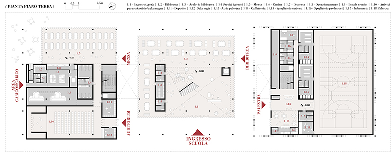 L'area di progetto, circondata su tutti i fronti dal verde, è attraversata da un asse est-ovest che connette il futuro Auditorium (ancora in fase di studio) con il nuovo edificio scolastico e fino agli altri istituti e alle aree sportive esistenti. Si viene a creare, così, un grande spazio arioso flessibile e fluido che apre lo scenario ad una molteplicità di usi diversi autonomi ma anche interconnessi tra loro.