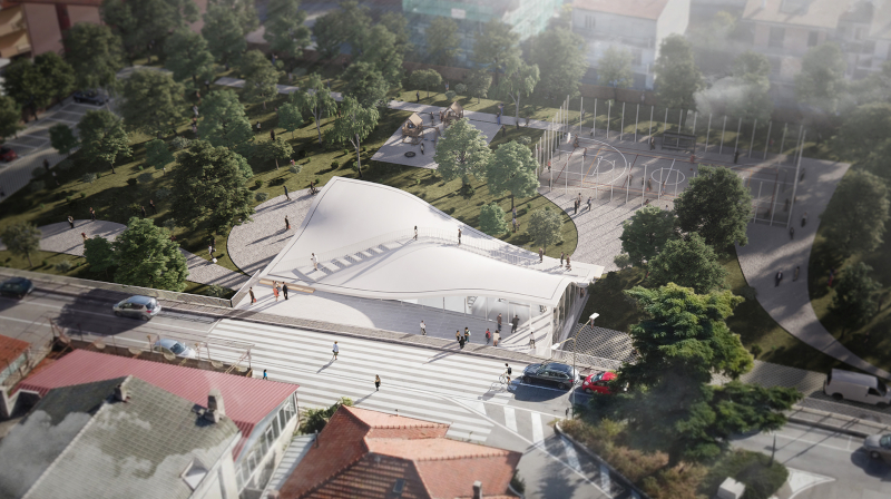 Il tetto della struttura diventa spazio pubblico percorribile, di collegamento tra la strada e l'area verde sottostante.