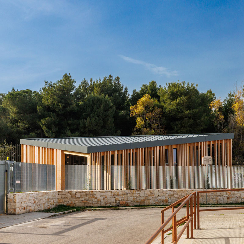 Il progetto ha coinvolto anche l'organizzazione dell'area verde circostante, della viabilità e dei parcheggi, progettati per garantire la massima permeabilità del suolo attraverso l'utilizzo di elementi autobloccanti verdi e limitando il surriscaldamento nelle ore più calde della giornata.