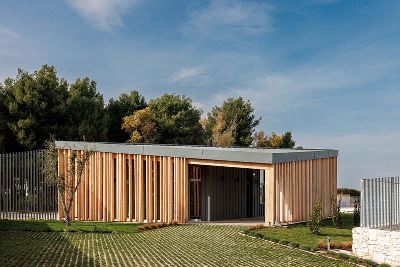 Dal punto di vista volumetrico, l'edificio, con tetto ventilato rivestito in lamiera di alluminio, si presenta compatto a nord e a ovest, con la struttura principale in legno lamellare e le tamponature a telaio con interposto isolamento. A est e a sud, invece, le due facciate dell'edificio sono arretrate rispetto alla linea del tetto, svelando la struttura in legno lamellare e gli elementi brise-soleil in legno che svolgono la duplice funzione climatica e di privacy rispetto alla strada e al resto della città.