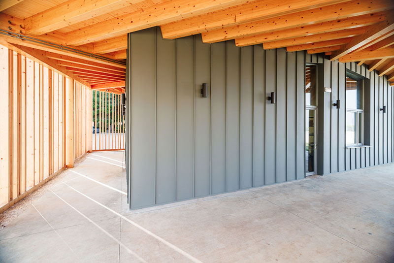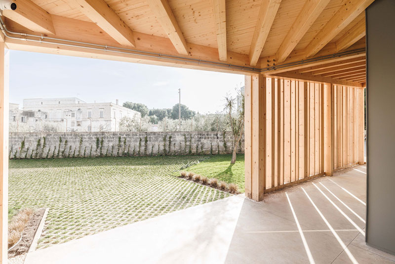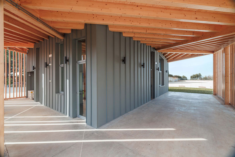 Ne deriva uno spazio porticato antistante la zona dedicata all'accoglienza e alla distribuzione dei pacchi per garantire riparo dalla pioggia e dal sole.