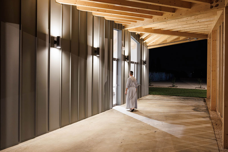 Posizionato a stretto contatto con il muro di cinta del lotto del convento, il padiglione solidale ne diventa parte integrante, fungendo da filtro tra il sacro della struttura religiosa e il profano delle strade cittadine.