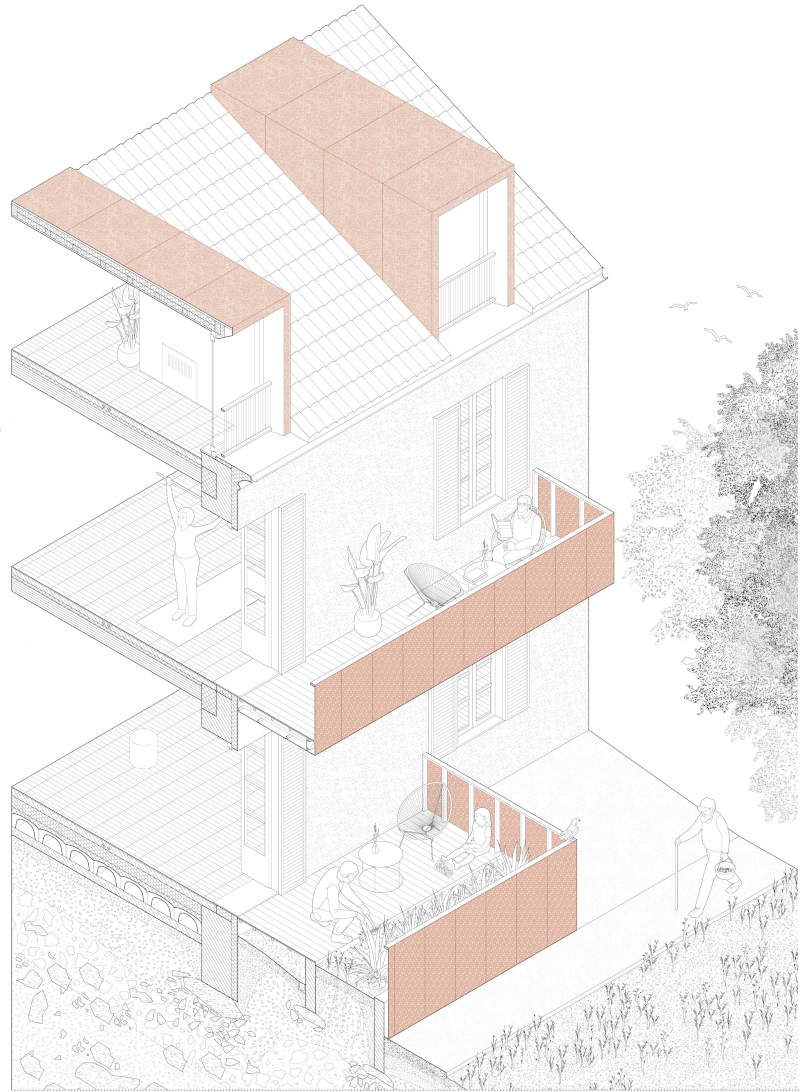 Le nuove terrazze sono pensate «come innesti dalla struttura leggera, reversibili, occasioni in grado di aumentare la qualità dell'abitare». Al piano terra questi volumi diventano giardini privati, «una stanza a cielo aperto con vista sul parco», così li definiscono i vincitori.